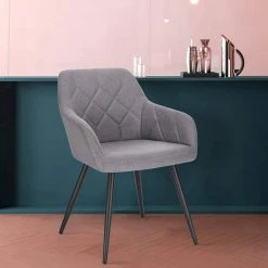 Die Beine des Esszimmerstuhls sind aus sehr stabilem Stahl, die Sitzfläche ist aus Leinen hergestellt.